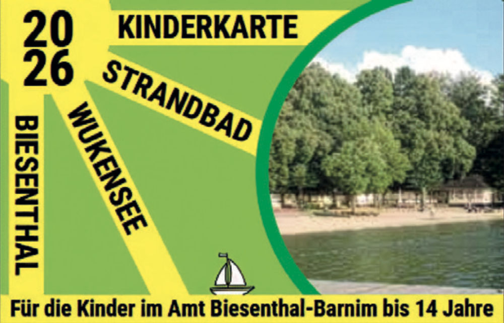 Auch im Sommer 2026 erhalten die Kinder im Amt Biesenthal-Barnim kostenfreien Eintritt in das Strandbad Wukensee. Kinder bis einschließlich 4 Jahre haben generell freien Eintritt. Für Biesenthaler Kinder ab 5 Jahren sind ab sofort die Kinderkarten für den freien Eintritt in das Strandbad Wukensee in den Kitas und Schulen, im Hort, im Rathaus und in der Amtsverwaltung erhältlich. Wir wünschen allen Kindern und ihren Familien eine erholsame und unbeschwerte Badesaison 2026 im Strandbad Wukensee.