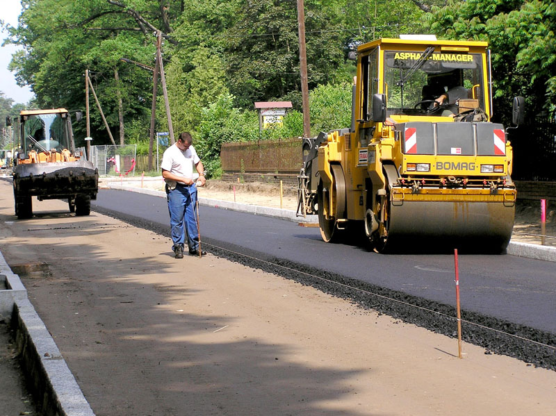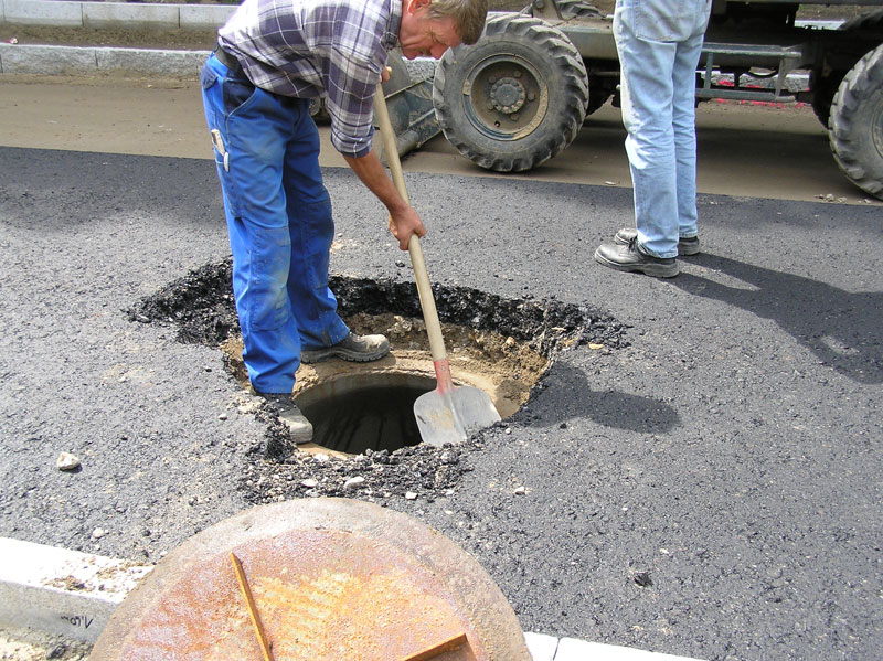 Auf diese „legte“ einen Tag später, am Mittwoch den 6. Juni 2007, die Asphaltiermaschine die 10 cm dicke Asphalttragschicht (Bild 1) und eine Walze verdichtete sie (Bild 2). Über den Einstiegschächten des Regenwasserkanals wurde sie wieder aufgebrochen, um die Höhenausgleichringe aufsetzen zu können (Bild 3).
