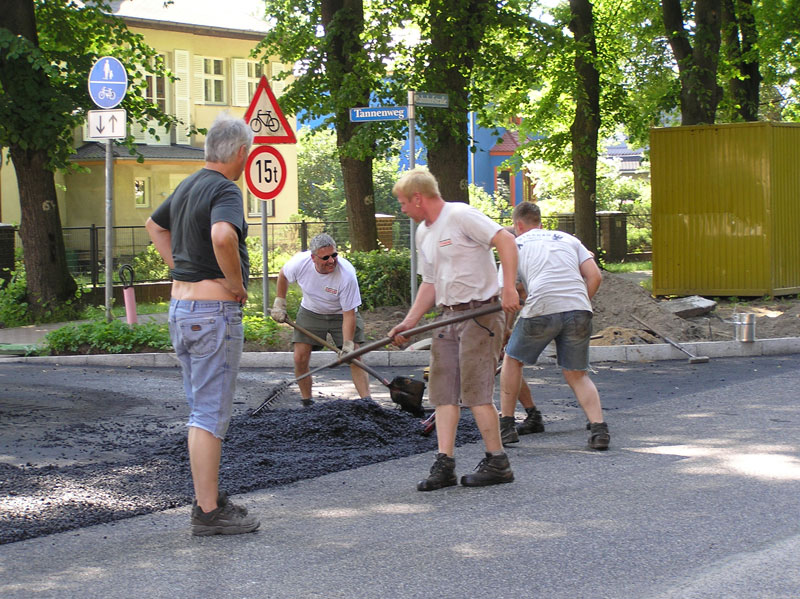 Einen weiteren Tag später, am Donnerstag den 07.06.2007, hat die gleiche Maschine eine dünne Bindeschicht aufgebracht (Bild 4) und am Nachmittag schon mit dem für den nächsten Tag vorgesehenen Arbeitsgang begonnen, dem Aufbringen der obersten, ebenfalls 4 cm starken Asphaltdeck- oder -verschleißschicht. Am Freitag, den 08.06.2007 15:05 Uhr war diese Arbeit an der Einmündung der Schubertstraße beendet (Bild 5). Es folgte noch das Aufbringen der Deckschicht in der Mündungstrompete des Tannenweges, wobei die Männer auch noch Handarbeit einsetzen mussten (Bild 6).