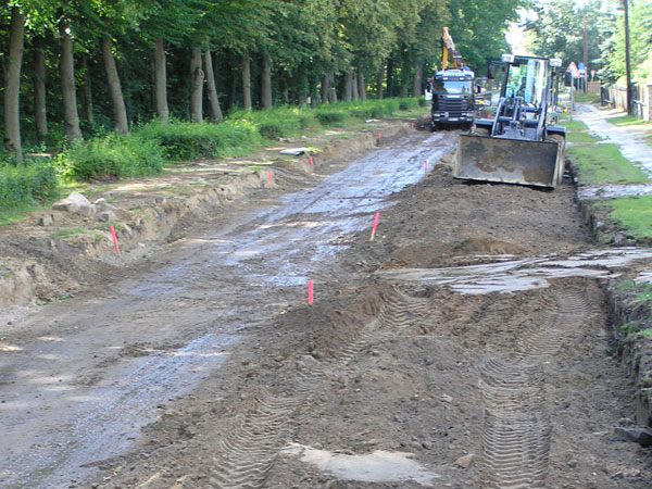 Heute wurde der schmale Streifen Pflaster zwischen der Parkstraße und der Einmündung Buchenallee bis auf einen kleinen Rest, der morgen drankommt, aufgenommen. Damit ist in diesem Abschnitt keine Durchfahrt mehr möglich.