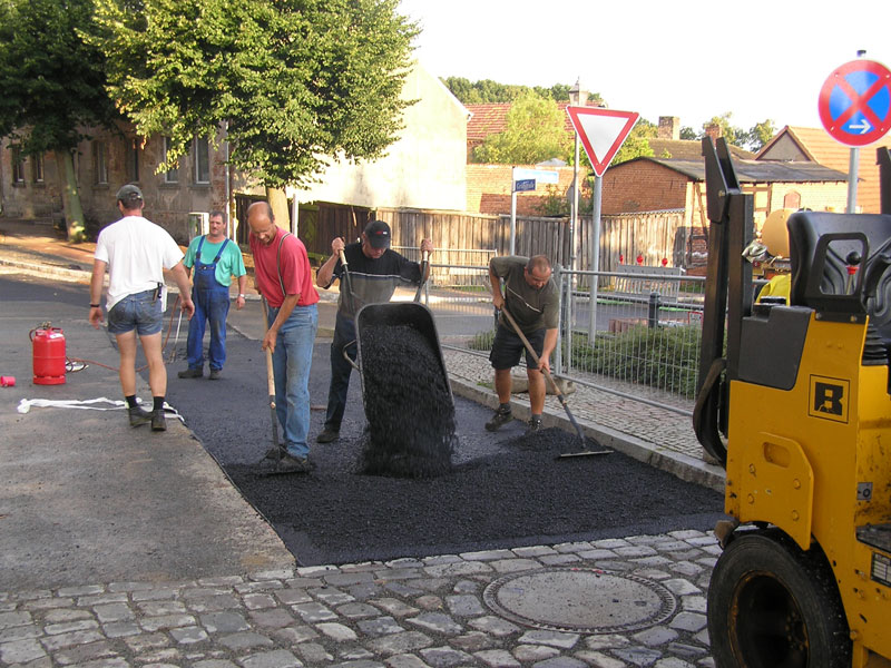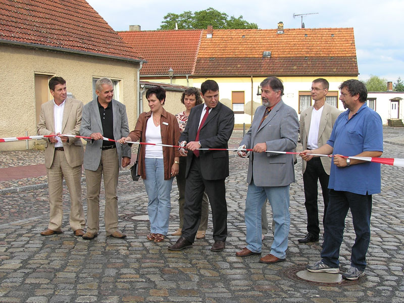 Während an der Einmündung dieser Straße in die Berliner Straße noch die letzten Arbeiten an der Asphaltdecke des Kreuzungsbereiches erledigt wurden (Bild 1), hatten sich Vertreter der Stadt, des Amtes, die Leitung des Baubetriebes Märkisch Grün, Melchow, des Projektierungsbüros Kunde, Biesenthal sowie einige Gäste am neu eingefassten Brunnen im Dreieck zwischen Grünstraße und Straße am Markt versammelt, um nach würdigenden Worten den traditionellen Schnitt durch das Absperrband vorzunehmen und die Straße freizugeben.