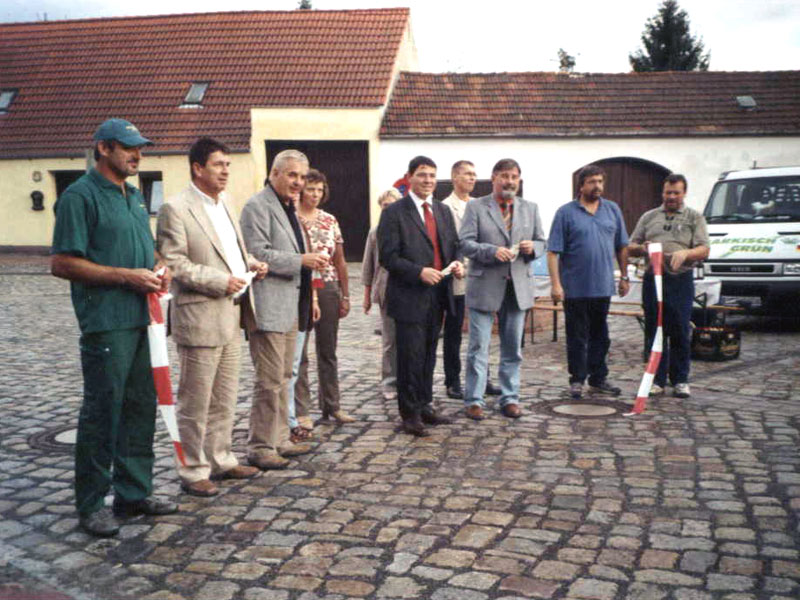 Eingeleitet und etwas verzögert wurde der Akt durch einen glücklicherweise nur kurzen, allerdings kräftigen Regenschauer, der die Beteiligten unter ihre Regenschirme zwang (Bild 2). Danach sprachen der Amtsdirektor, Herr Kühne, der Bürgermeister der Stadt Biesenthal, Herr Stahl, und der Seniorchef des bauausführenden Betriebes, Herr P. Jahn. Jeder von ihnen umriss einige der den Bauablauf verzögernden Schwierigkeiten und würdigte deren Bewältigung. Schwierige Bodenverhältnisse, verstärkt durch das lange Zeit regenreiche Wetter einerseits und zahlreiche Funde von Spuren der alten Bebauung und Straßenbefestigung im Zentrum der Stadt hatten immer wieder den Baufortschritt gehemmt.