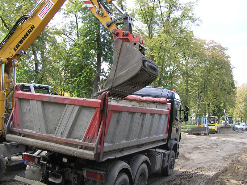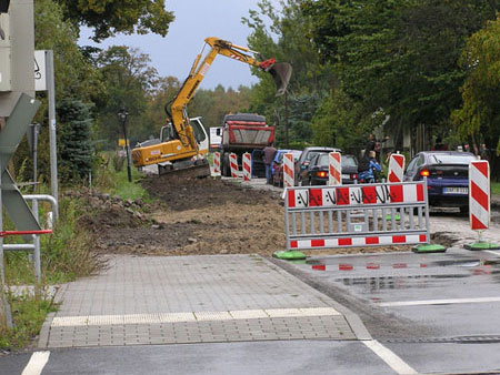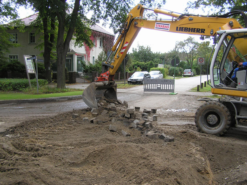 Nun können in den restlichen knapp zweihundert Metern des dritten Abschnittes (Steinstraße – Schubertstraße) der Sanierungsstrecke die restlichen Erdbauarbeiten (Auskoffern und Frostschutzschicht einbringen) und das Setzen der Bordsteine und der Regeneinlaufschächte erledigt werden. Fa.Brodmann arbeitet jetzt mit Hochdruck und hat auch schon den vergangenen Sonnabend (15.9.) drangegeben. Vielleicht muss auch der nächste noch dran glauben, denn in der nächsten Woche sollen nach Plan die Maschinen für den vollständigen Straßenaufbau wieder anrücken.