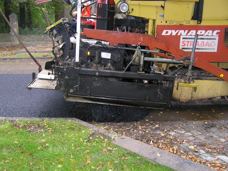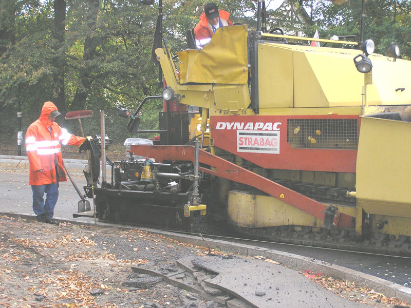 Für die sonst oft von Überstunden geplagten Männer nahte also ein ungewollt früher Beginn des Wochenendes, leider erst mal verbunden mit dem schalen Gefühl, den „Kampftermin“ des 30.09. wegen des Versagens der Technik verpasst zu haben1). Offensichtlich waren aber alle Beteiligten bei Strabag daran interessiert, die Unterbrechung so kurz wie möglich zu halten. Und so wurde noch am Wochenende eine kleine Ersatzmaschine für das Auftragen der restlichen „Asphalt“-Flächen in den Trompeten der Karl-Marx-Straße, der Steinstraße und der Kiefernallee nach hier transportiert (Bild 11-9), sodass diese Arbeiten schon gestern, Montag den 1. Oktober in der Mitte des Vormittags erledigt waren.