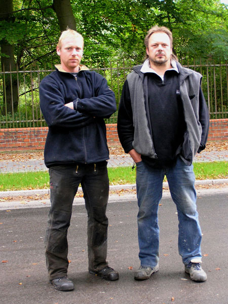 Das Hochfahren der Begrenzungsplatten der Maschine (Bild 11-7) zeigte das Ende dieses letzten Arbeitsganges für das neue Straßenband an. Der Bauleiter der gesamten Sanierung und der Polier der Asphaltverlegemannschaft (v.re.n.li) ließen ein Foto zu, obwohl es noch kein Siegesbild sein konnte (Bild 11-8).