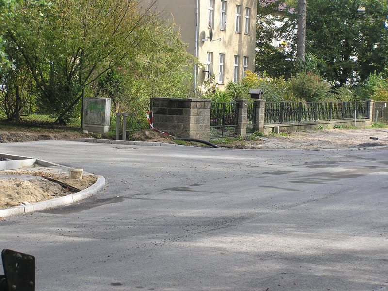 Vielleicht wusste der Polier der Asphaltiermannschaft am Freitag Mittag wirklich noch nichts von dieser schnellen Lösung, jedenfalls erfuhr der Berichterstatter nichts davon und erst recht konnte er es auch nicht ahnen. So hatte er das Nachsehen und konnte den denkwürdigen Augenblick des allerletzten Auftragens von Asphalt zwischen Stadt und Bahnhof nicht fotographisch dokumentieren sondern nur das Ergebnis in der Trompete zur Kiefernallee aufnehmen (Bild 11-10).