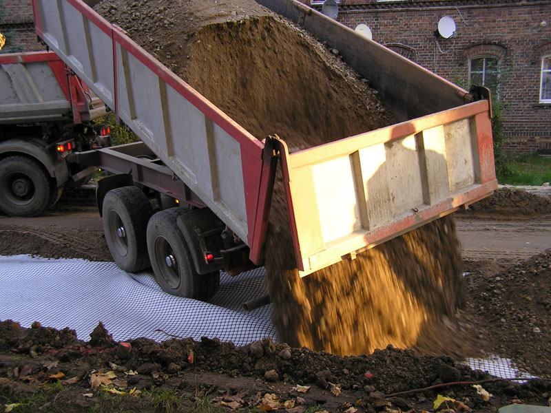 Und die Arbeiten für das kommende Aspaltdecken-Stadium auch auf den letzten 220 Metern am Ostende der Bahnhofstraße folgen dem Abbau wieder mit Hochdruck auf dem Fuße: dort, wo gestern früh am Bahnübergang die letzten Steine entfernt wurden, wurden heute Mittag (Mittwoch, 10.10.07) die letzten Schaufeln Erdreich der Auskofferung des Straßenbettes ausgehoben und verladen (Bild 12-2). Der dazu eingeteilte Lkw war nicht leer gekommen, sondern hatte Betonrecycling für die Frostschutz-Unterschicht mitgebracht (Bild 12-3).