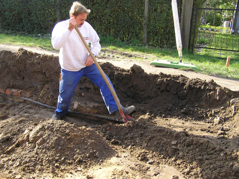 Nachdem gestern schon ein wegen seiner Verlegeart nicht durch ein Warnband angezeigtes und dazu noch außerordentlich flach liegendes Telefonkabel ärgerliche Schwierigkeiten gemacht hatte, verzögerte sich heute Vormittag stellenweise die Auskofferung wegen weiter zu erwartender Kabel durch vorsichtige „Millimeterarbeit“. Und tatsächlich kam ein nur 40 cm unter Geländeoberfläche liegendes und auf reichlich 5 m mit seiner Richtung aus der Spur geratenes dickes Kabel zum Vorschein. In diesem Bereich musste Mario Schilling seine Schalthebel und die Maschine verlassen und wie früher zur Handschippe greifen (Bild 12-4).