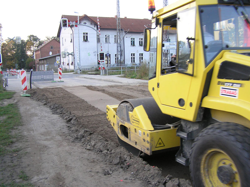 Nachdem am frühen Nachmittag noch die Trompete zum Melchower Weg ausgekoffert worden war wurden noch zwei große Ladungen Recycling für die Frostshutzschicht angeliefert. Und so saßen am Abend (nach 18 Uhr!) der Bauleiter Ulf Wittstock und „seine rechte Hand“, Mario Schilling (die beiden heute einzigen Verbliebenen der Strabag-Erdbau-Mannschaft!) selbst auf den Maschinen und verteilten und walzten das letzte Frostschutzmaterial bis an den Bahnübergang (Bild 12-5, 12-6).