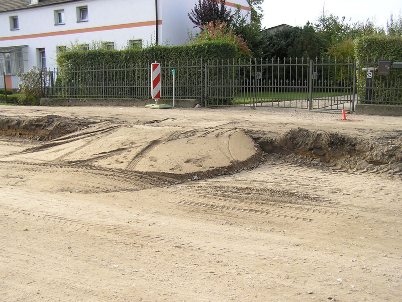- Auch die Endfertigung des Streifens zwischen Fußweg und der Bordsteinkante auf der N-Seite der Straße zwischen Melchower Feld und Steinstraße macht Fortschritte: am W-Ende ist schon seit Ende voriger Woche (40. KW) Mutterboden aufgebracht und Grassaat mit einer charakteristische Furchen erzeugenden Maschine gestreut (Bild 12-9). Die Auskofferung dieses Streifens als Vorbereitung für den Mutterbodenauftrag erreichte heute die Ahornallee.