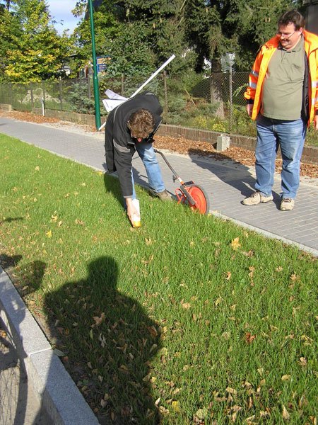 - Heute wurde auch der erste Schritt für das zukünftige Wiederentstehen des Alleencharakters der Bahnhofstraße getan: Herr Otte vom Auftraggeber Landesbetrieb für Straßenbau und Herr Berg von Firma Brodmann markierten im 13 m-Abstand mit orangefarbener Sprühfarbe die Lage der Pflanzgruben für die Linden (Bild 12-10), die so schnell wie möglich in den Boden sollen, aber wohl nur im Ost-und Westabschnitt der Straße. Denn zwischen Stein- und Schubertstraße wird ja sicher noch volle Baufreiheit für alle Arbeitsgänge am Fußweg und seinen Begleitstreifen gebraucht.