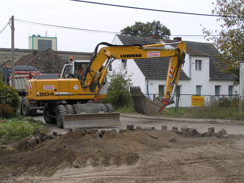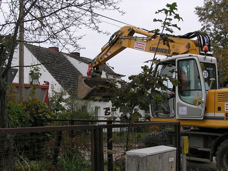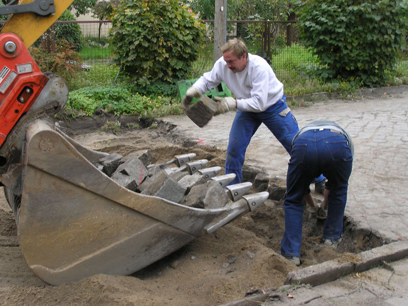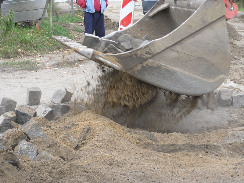 Heute, Donnerstag den 11. Oktober 2007 wurde bei den Arbeiten zur Sanierung der Bahnhofstraße Biesenthal zwischen 11:50 Uhr und 11:55 Uhr die letzte Baggerschaufel Pflastersteine vom heute als Baggerführer arbeitenden Mario Schilling der Erdbaumannschaft von Strabag (Bild 13-1) aus ihrem Bett gehoben (Bild 13-2), ausgesiebt (Bild 13-3 von vorhergehendem Arbeitsgang) und, nachdem die letzten Steine von Hand dazu geworfen waren (Bild 13-4), auf dem Lkw der Firma Korduan mit Max am Steuer abgekippt (Bild 13-5 und 13-6).