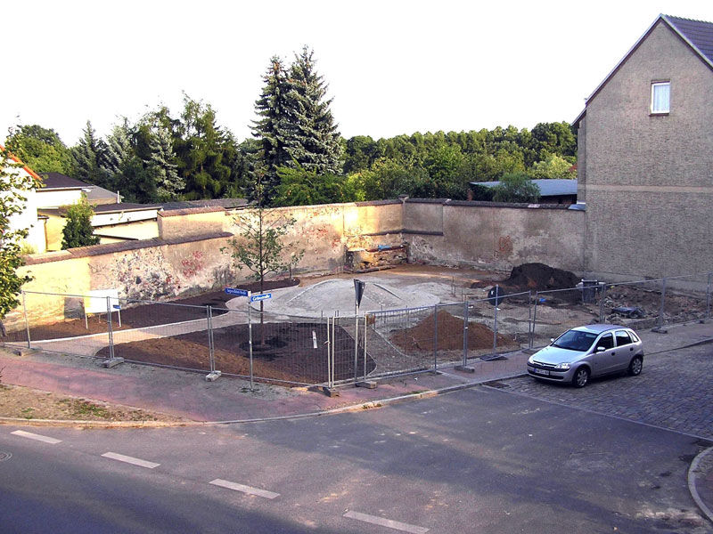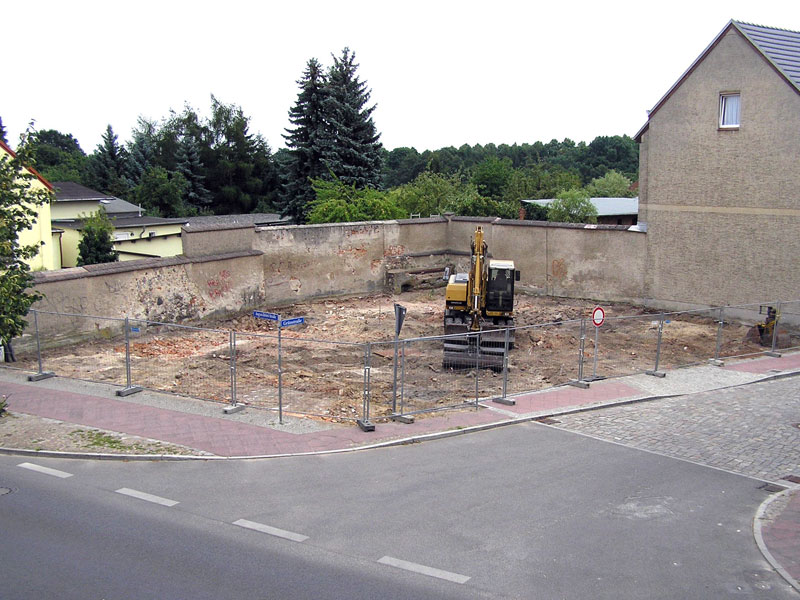 Bis Sonntag den 3. August 2008 sah die Ecke August-Bebel-Straße/Grünstraße noch so aus, wie sie 26 Jahre lang ausgesehen hat (Bild 1). Einen Tag später aber, vor rund vier Wochen, rückte schweres Gerät der Firma Märkisch Grün an, um mit dem Planieren zu beginnen und einen weiteren Tag später, am Dienstag 5. August, war alles umgewühlt und schon viel von den Schuttresten der alten Gebäude abgefahren (Bild 2). Unerwartete Verhältnisse an einigen Stellen der Fläche benötigten zwar zusätzliche Entscheidungen über die weitere Verfahrensweise. Diese konnten aber trotz Urlaubszeit schnell herbeigeführt werden, sodass die Arbeiten schon ab Freitag 8.August weitergingen. An den drei Teilaufgaben – Umgestaltung der Fläche, Bau des Pflasterdenkmals und Bau einer niedrigen Feldsteinmauer als teilweise Begrenzung zur Grünstraße - wurde so viel wie möglich gleichzeitig gearbeitet. Allerdings musste für die Arbeiten am Pflasterdenkmal noch längere Zeit genügend Platz für die Zufahrt des ungefügen Schaufelladers frei gehalten werden. Am 20.8. aber waren die Pflastersteine durch zwei von Märkisch Grün „angeheuerte“ Spezialisten aus der Gilde der Steinsetzer oder Pflasterer weitgehend gesetzt, nur die Verfugung fehlte noch (Bild 3).