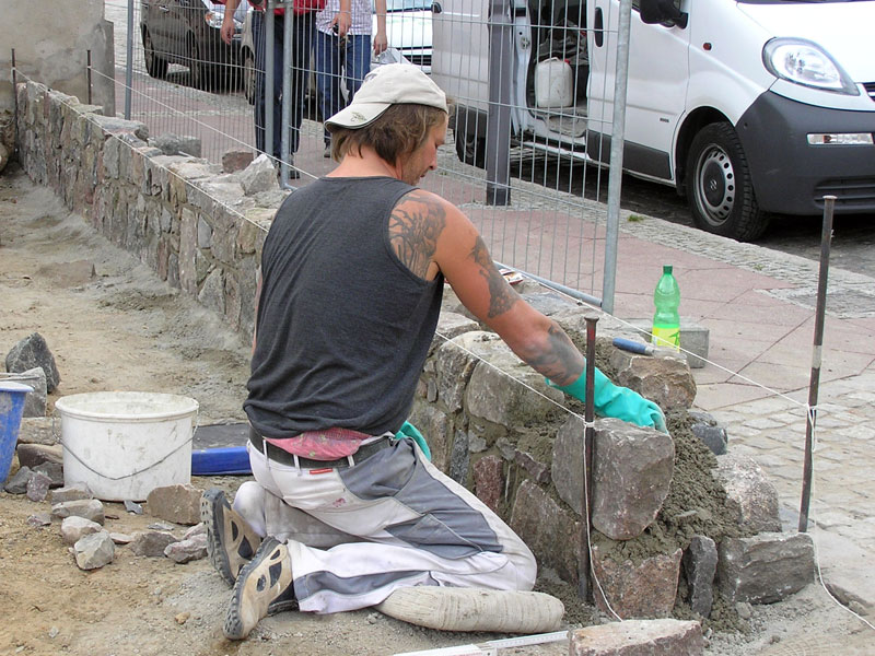 Zwei Tage später war auch das erledigt und es zeichnete sich das Gesamtaussehen der Anlage schon deutlich ab (Bild 4). Auf diesem Bild erkennt man rechts unten entlang der Grünstraße etwas undeutlich eine niedrige Mauer. Hier war seit Montag, den 18. 8. parallel zu den anderen Arbeiten von einem auch auf Feldsteinmauerei spezialisierten Mitarbeiter der Firma Thomas Czekalla, Biesenthal und seinem Kollegen in echter Maurer-Handwerkskunst eine Feldsteinmauer gebaut worden (Bild 5). Am Donnerstag, den 21.8. hatten die Männer von Märkisch Grün eine Eiche in ihre Pflanzgrube gesetzt (Bild 6). So ließ am Samstag, den 23.8. dieser bisher unschöne Fleck mitten in unserer Stadt insgesamt schon sein zukünftiges Aussehen ahnen (Bild 7). An diesem Tag gaben Vertreter unserer polnischen Partnerstadt Nowy Tomysl durch einige zusätzliche Schaufeln Erde zusammen mit Bürgermeister Stahl und Amtsdirektor Kühne der Eiche ihre Weihe.