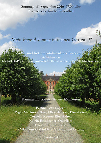 Der Kammermusikkreis Niederschönhausen unter Leitung von Kirchenmusikdirektor Konrad Winkler führt Werke der Vokal- und Instrumentalmusik der Barockzeit von J. S. Bach, G. Ph. Telemann, A. Corelli, H. Purcell u.a. auf.