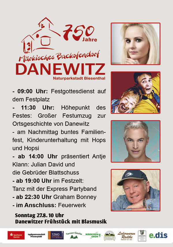 Am Sonntag, den 27.08. ab 10:00 Uhr laden die Danewitzer zum gemeinsamen Frühstück mit dem Hennigsdorfer Blasorchester ein. Um ca. 15:00 Uhr endet das Festwochenende zur 750 Jahr Feier.