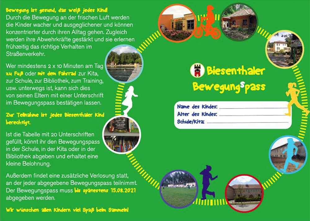 Ab sofort ist der Biesenthaler Bewegungspass für Biesenthaler Kinder in den Kita’s, in den Schulen, in der Bibliothek, im Kulti und beim Sportverein SV Biesenthal 90 e.V. erhältlich. Die Kinder sollen motiviert werden, auf das „Elterntaxi“ zu verzichten und ihre Wege zu Fuß oder per Rad zu unternehmen.