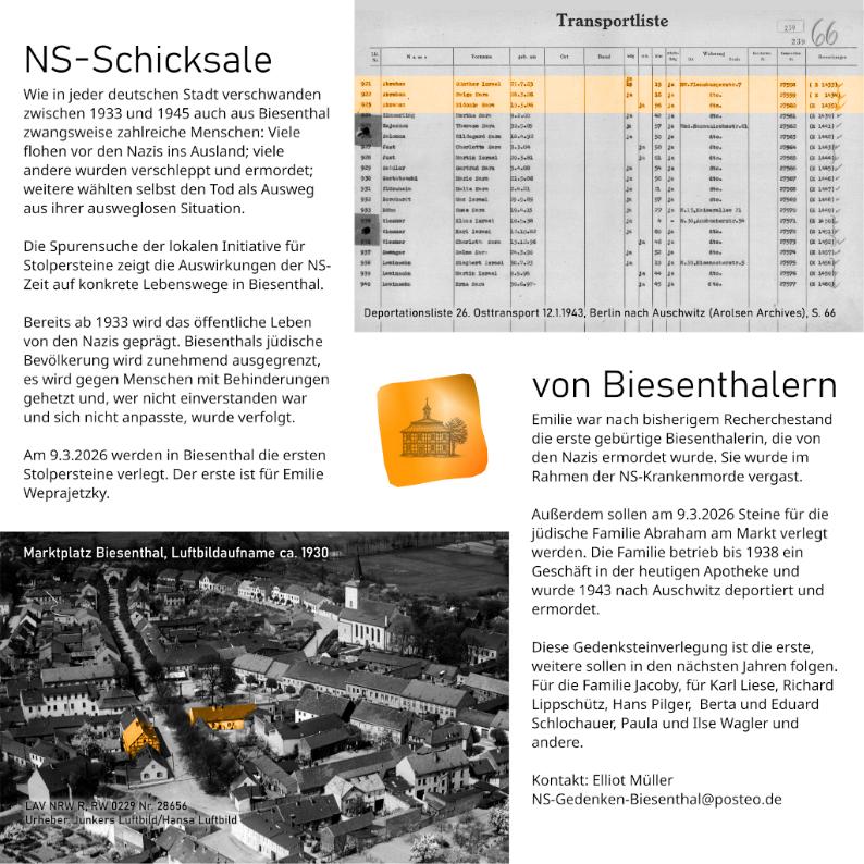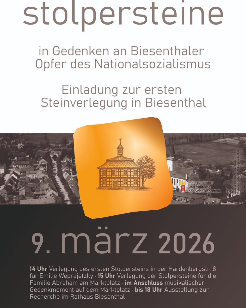 Die Verlegung der Stolpersteine am 9. März 2026 beginnt um 14 Uhr in der Hardenbergstraße 8 mit dem Stein für Emilie Weprajetzky. Danach folgt um 15 Uhr die Verlegung für Leo, Johanna, Günther und Helga Abraham und Ernestine Schoeps vor der Apotheke am Markt 5 und für Toni (Sidonie) Abraham Am Markt 3. Im Anschluss gibt es einen musikalischen Gedenkmoment am Marktplatz und die Möglichkeit eine kleine Ausstellung zu den NS-Opfern aus Biesenthal im Rathaus zu besichtigen.