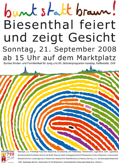 Es war das, was unsere Stadt ausmacht, ein buntes Fest mit vielen Bürgerinnen und Bürgern. Ob es die Programme der Kitas, der Schule, der Musikschule Fröhlich, der Liedermacher, Sänger und Hip-Hop-Gruppen auf der Bühne waren, oder die vielen Stände der Vereine, Institutionen und Jugendgruppen, alles machte diesen Nachmittag zu einem schönen und abwechslungsreichen Sonntag. Und nach der 750-Jahrfeier war es wieder ein Beweis dafür, dass Biesenthal feiern kann und die Biesenthalerinnen und Biesenthaler zu ihrer Stadt stehen. Dass mehr als 1000 Menschen Gesicht zeigten, macht Hoffnung, dass Biesenthal ausschließlich als weltoffene und tolerante Stadt in den Medien wahrgenommen werden kann. Allen Aktiven Respekt und Dank. (mm)