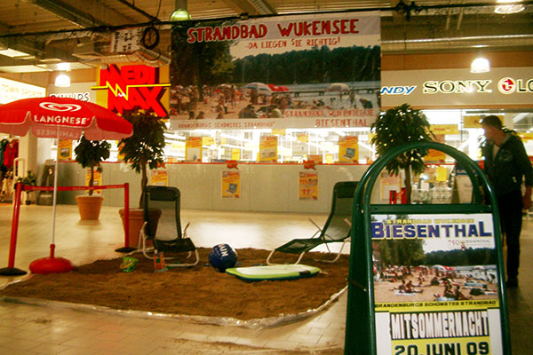 Da das Wetter in diesem Sommer derzeit nicht unbedingt zum Baden einlädt, wurde das Strandbad in die Halle verlegt. Genauer gesagt in den ersten Stock der Bahnhofspassage in Bernau. Pünktlich zum Beginn der Hussitenfestwoche kann man jetzt wetterunabhängig Strandatmosphäre genießen. Die Werbeaktion läuft bis zum 14.06.09 und wird hoffentlich viele Besucher auf Brandenburgs schönstes Strandbad aufmerksam machen. Übrigens – einen kleinen Wermutstropfen gibt es – man kann dort nicht baden.