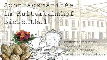 An jedem dritten Sonntag im Monat lädt der Bahnhof Biesenthal zu einer besonderen Veranstaltung ein: die Matinée. Zu leckerem Biobuffet wird Kultur gereicht. Ab 11 Uhr bitten wir zu Tisch: mal französisch, mal sorbisch, mal italienisch, mal Überraschung. Kultur pur dann ab 12 Uhr: Musik oder Theater, ernst oder frivol, zum Mitmachen oder Genießen. Sich mit anderen Familien oder Freunden treffen; neue Menschen kennenlernen und Nahrung nicht nur für den Magen, sondern auch für den Kopf!