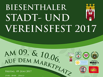 Auf Initiative vieler Biesenthaler Vereine findet am 9. Juni und 10. Juni 2017 das Stadt- und Vereinsfest auf dem Marktplatz statt. Die Stadt Biesenthal wird diese Feierlichkeit als Veranstalter begleiten. Innerhalb dieses Festes begeht die Schützengilde Biesenthal 1588 e.V. ihr 25. Schützenfest und gleichzeitig das Kreisschützenfest. Die aktuelle Planung sieht für Freitag, den 9. Juni 2017 eine Disco und den Auftritt einer Live-Band und für Samstag, den 10.06.2017 ab 11.00 Uhr den großen Schützenumzug vor. mehr...