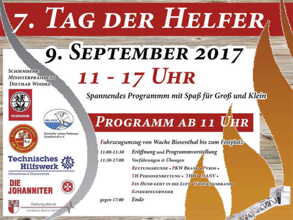 Zum siebten Mal findet am Samstag, 9.9., der Tag der Helfer auf dem Eulenberg statt. Die Freiwillige Feuerwehr organisiert diese Veranstaltung, zahlreiche Rettungsorganisationen – Technisches Hilfswerk, Die Johanniter, DLRG u.a. – wirken mit. Von 11 bis 17 Uhr werden spektakuläre Rettungsübungen vorgeführt. Ab 19 Uhr feiert die Freiwillige Feuerwehr Biesenthal ihr 110-jähriges Bestehen mit einer Schlagerparty mit DJ Chris.
