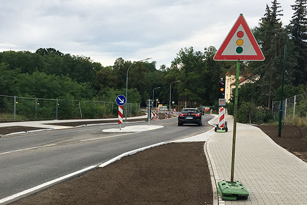 Pünktlich zum Schulanfang wurde die Vollsperrung der L200 zwischen Gartenstraße und Abzweig Danewitz aufgehoben. Der neue Ortseingang mit Mittelinsel ist bereits erkennbar. Die noch fehlenden Teilstücke des neuen Radwegs – die Brücke über das Fließ und der Anschluss an die innerstädtischen Radwege – sollen laut Plan bis Oktober fertig gestellt sein. [lb]