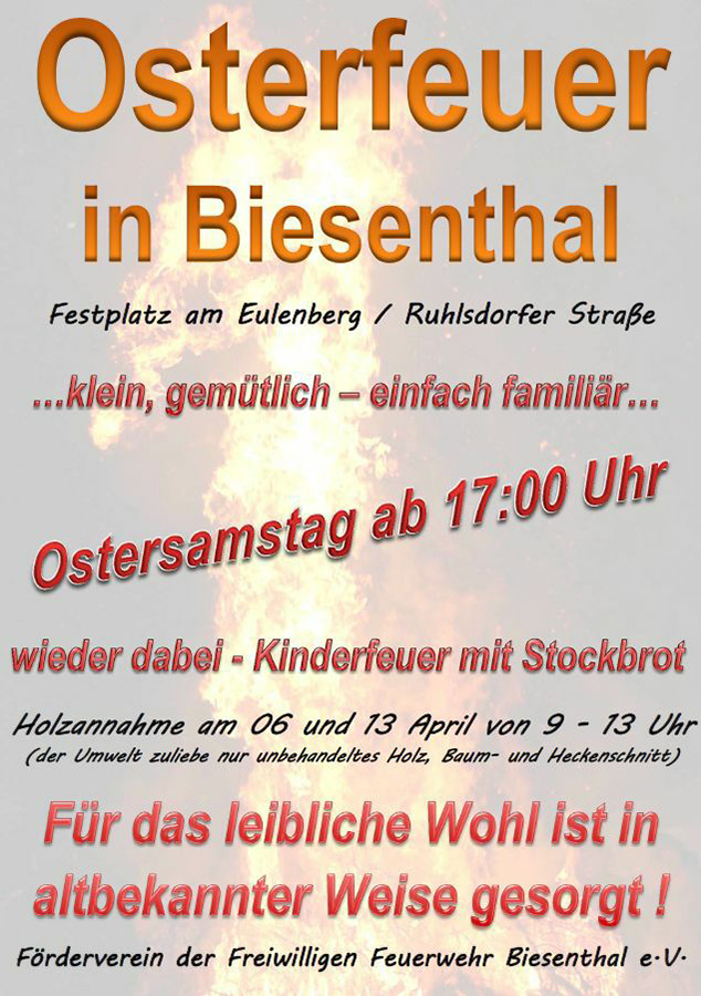Einladen möchte ich Sie ganz herzlich zum Osterfeuer auf dem Eulenberg am Ostersamstag ab 17.00 Uhr.